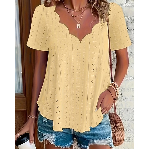 Damen Bluse Einfach Aktiv Basic Lässig Kurzarm V Ausschnitt Normale Oberteile Täglich Ferien Ausgehen Lochmuster Schwarz Weiß Gelb Rosa Purpur Sommer Frühling