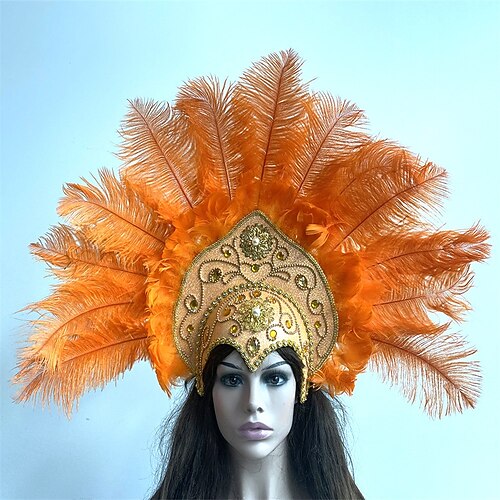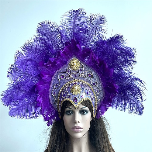 Karneval 2026 Rio de Janeiro: Samba-Accessoires, luxuriöser lila Federkopfschmuck, Kostüm für brasilianische Festivalauftritte
