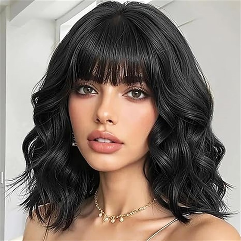 Curly Wigs for Black Women 14'' Short Silver Grey Wavy Bob Hair Wig with Bangs Natural Heat Resistant Synthetic Wigs