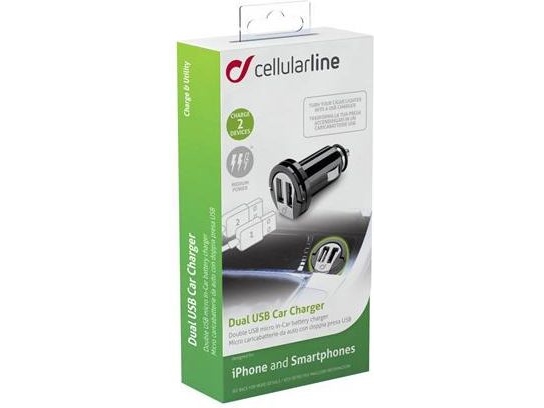 Cellularline USB Car Charger Dual - Universal Akkuladegerät für das Auto mit doppelter USB-Buchse 10 W, Auto, Zigarettenanzünder, 5 V, Schwarz