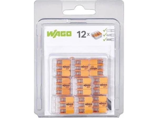 WAGO Fjeder Samlemuffe 3x0,14-4 mm². Transparent plast, med orange vipper, skrueløs, Halogenfri. BLISTERPAKKE 12 stk.
