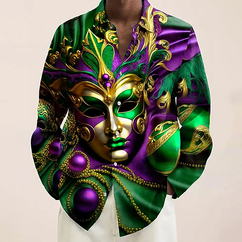 Mardi Gras Men's Mask Carnival Beads Shirt Button Up Shirt Long Sleeve Fashion Casual Party Holiday Spring Fall Turndown 3D Print Collared Shirts Blue Purple Green Dark Purple