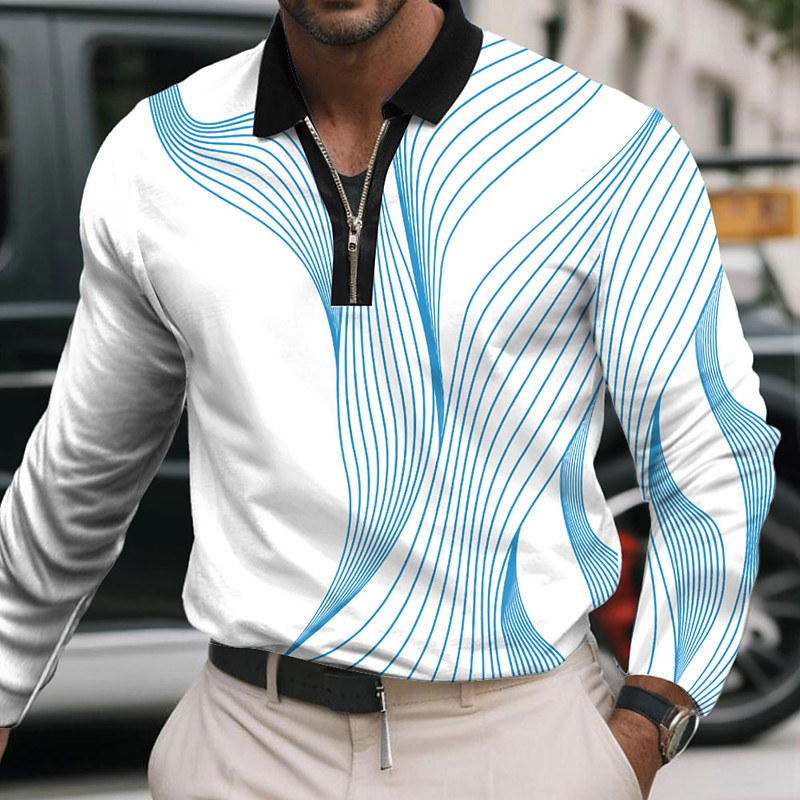 Men's Geometric Line Polo Long Sleeve Polo Shirts Lapel Business Casual Athleisure Daily Wear 3D Print Quarter Zip Polo Spring Fall Winter Black White Blue