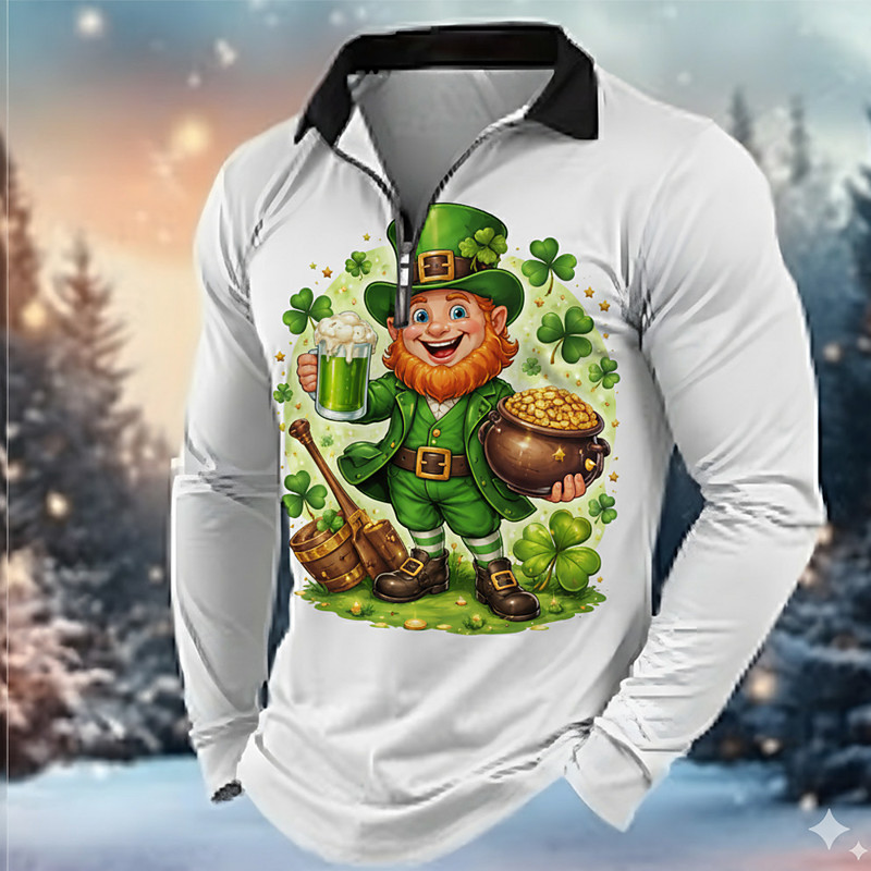 St. Patrick Men's Four Leaf Clover Gnome Polo Long Sleeve Turndown Modern Leisure Athleisure Casual Daily Festival Zipper 3D Print Spring Fall White Green