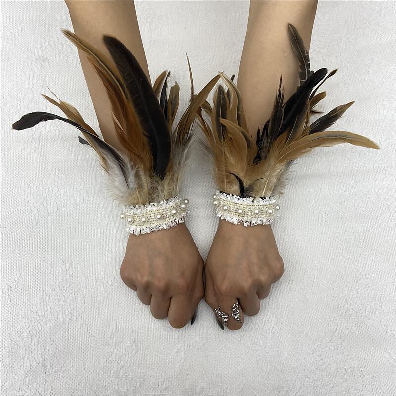 Carnival 2026Rio Carnival Samba Accessories Women's Green Feather Wrist Cuffs with White Pearl Lace Brazil Festival Performance Costume