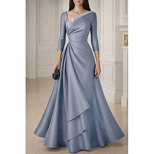 Linea ad A Lunghezza al pavimento Perline ricamate Abito Formale Abito da madre della sposa Abito da Sera Da principessa Abito formale Elegante Setoso Manica 3/4 Girocollo Matrimonio Formale Tasca