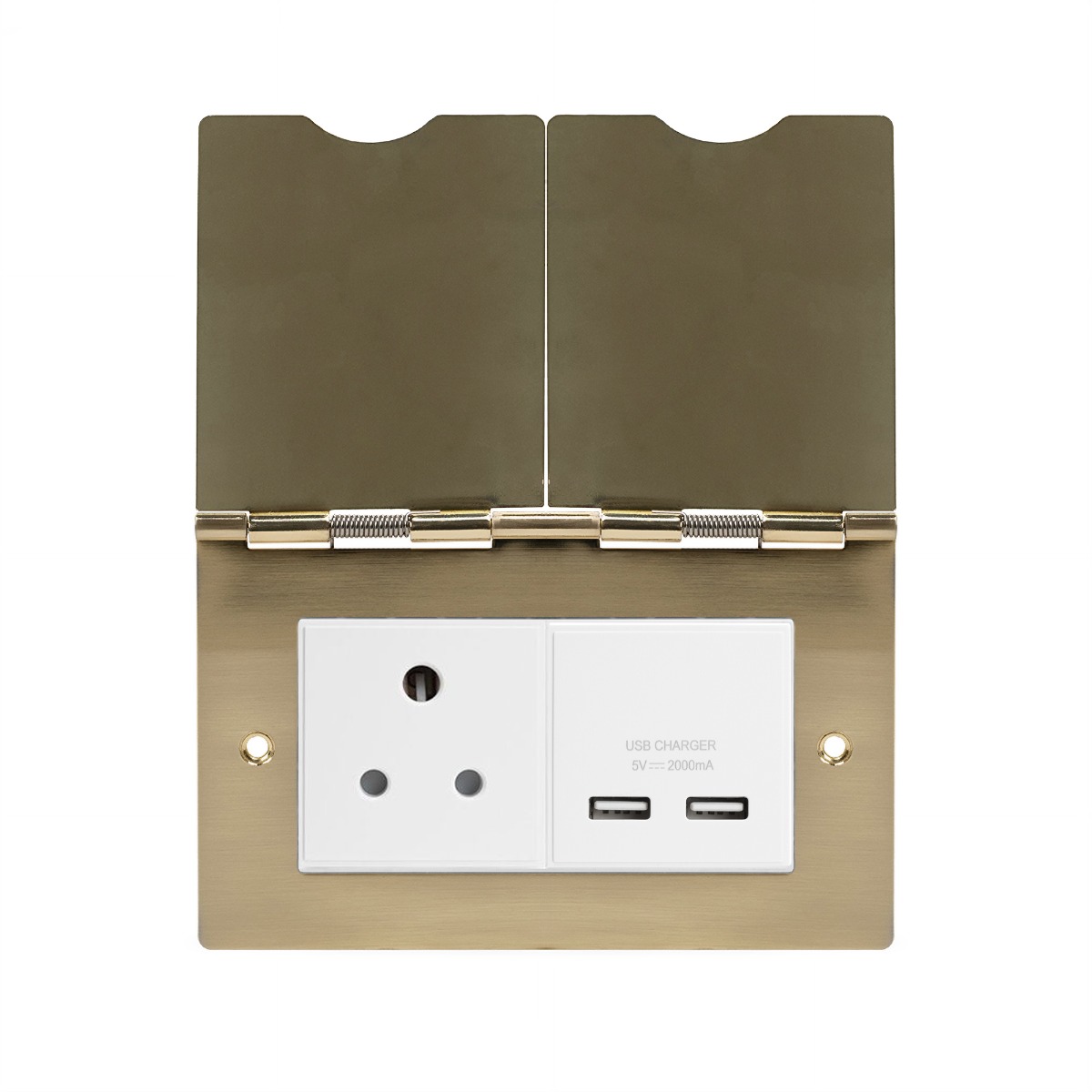 Soho Lighting Brushed Brass Screwless Double Floor Outlet 5Amp Socket & USB Charger White Inserts
