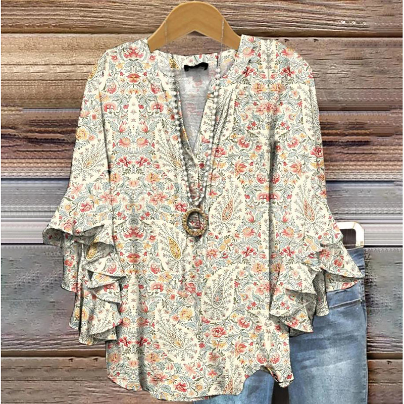 Women's Retro Blouse Layered Ruffle Sleeve Tops Vintage Floral Graphic Bohemia Vintage Daily 3/4 Length Sleeve Regular Tops Daily Holiday Vacation Wear Print Red Blue Beige Summer Spring Fall
