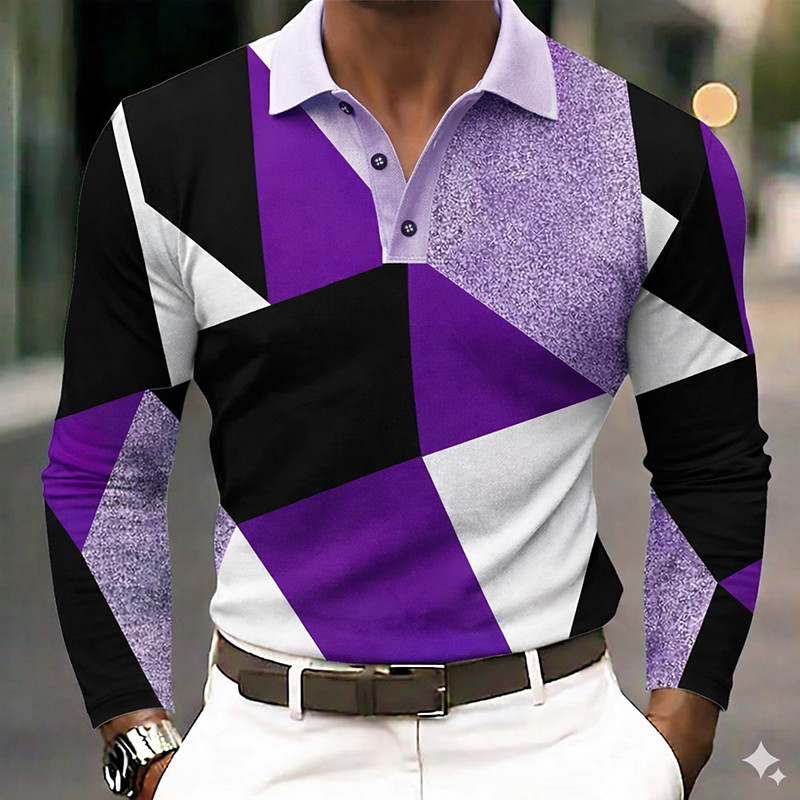 Men's Color Block Geometic Polo Shirts Long Sleeve Polo Shirts Lapel Business Casual Outdoor Athleisure Daily Wear 3D Print Buttons Spring Fall Blue Red Purple