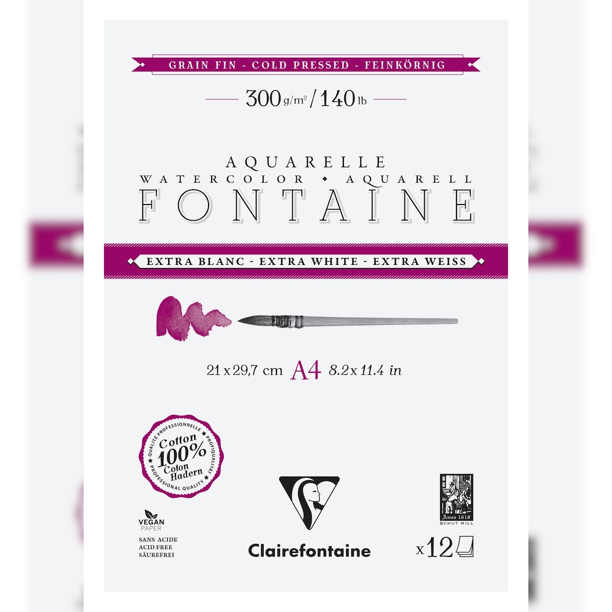 Clairefontaine 5x Fontaine, Aquarellpapier extraweiß feinkörnig, Block 2-seitig geleimt, 12 Blatt A4 300g - 976047C
