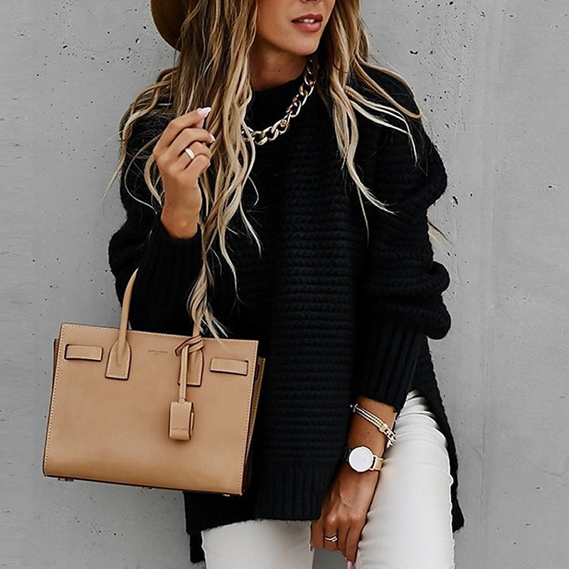 Women's Sweater Pullover Fashion Solid Color Ribbed Crew Neck Knitted Long Sleeve Regular Tops Knit Outdoor Holiday Going out Black White Fall