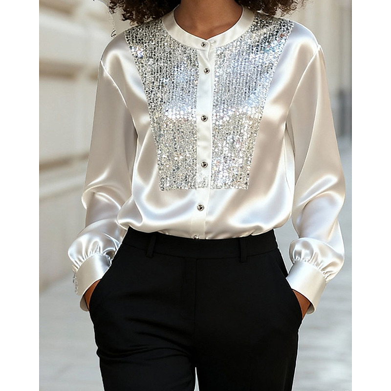 Women's Shirt Blouse Solid Color Elegant Stylish Long Sleeve Crew Neck Regular Tops Daily Work Holiday Sequins Buttons White Summer Spring Fall
