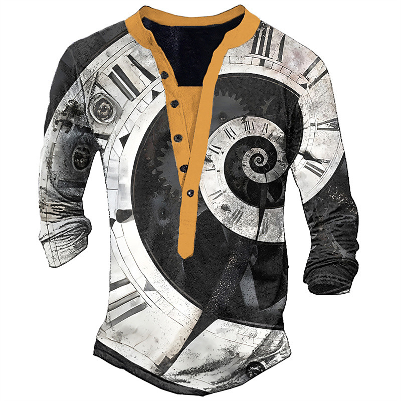 Men's Graphic Prints Clock Henley Shirt Graphic Tee Vintage Shirt Long Sleeve 3D Printing Fashion Basic Casual Outdoor Vacation Daily Spring Fall Dark Brown Brown Dark Gray Henley Henley T-Shirt