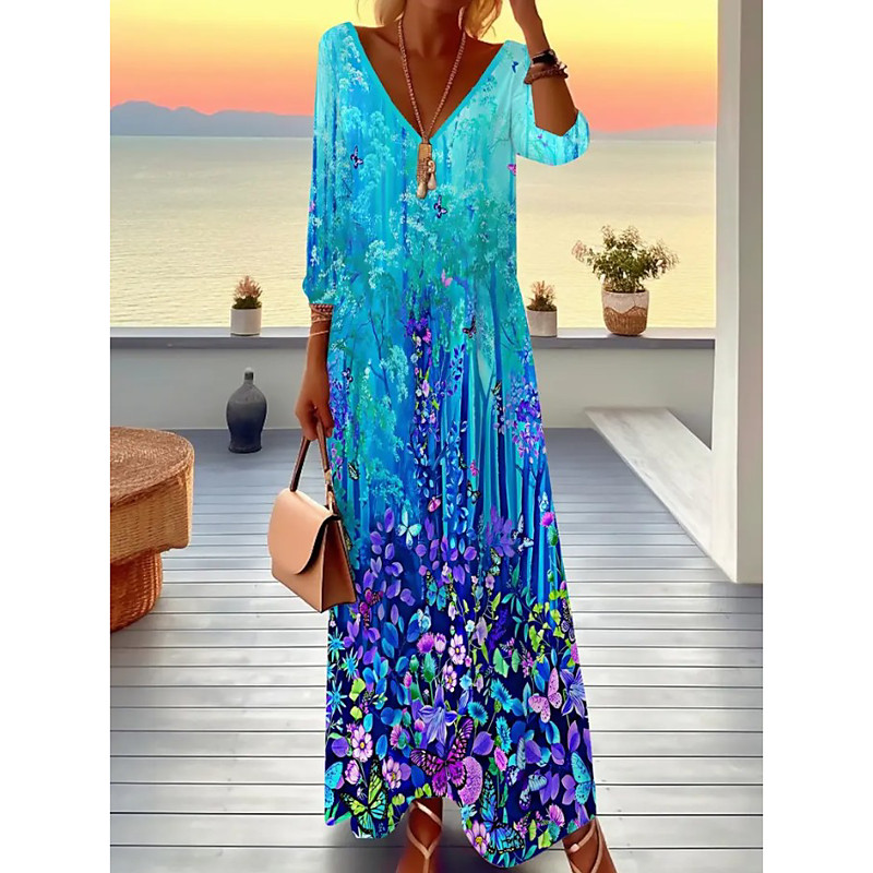 Women's Maxi Dress Kaftan 3/4 Length Sleeve Crew Neck Casual Shift Dress A Line Dress Dress Boho Daily Holiday Date Floral Graphic Dark Yellow Light Pink Yellow Light Green