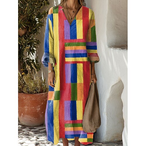 Abito Midi Donna V Neck Maniche Lunghe Kaftan Leggero Fit Largo Abito Shift Casual Uscita Fit Largo Grafico Geometrico Maniche Lunghe V Neck Giallo Verde Chiaro Rosso Verde Autunno