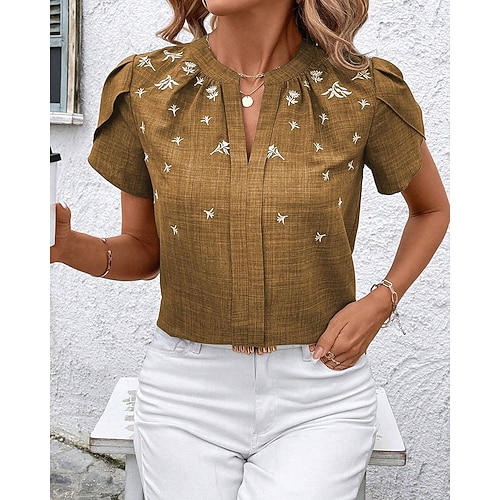 Per donna Blusa Floreale Elegante Manica Corta Scollo a V Top Regolari Quotidiano Ferie Uscire Arricciato Stampato Nero Vino Blu Reale Verde Cachi Estate Primavera Autunno