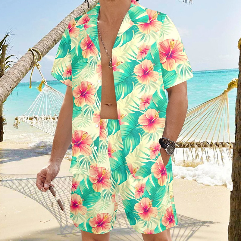 Men's Floral 2pcs Shirts Sets Summer Hawaiian Shirt Short Sleeve Short Pants Turndown Casual beach vacation Casual Daily Vacation Wear 3D Print Summer Light Pink Green