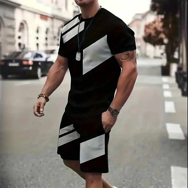 Men's Geometric 2pcs Tees sets Summer Tops Short Sleeve Short Pants Crew Neck Athleisure Sport Casual Daily 3D Print Summer Robin's Egg Blue Grey Green