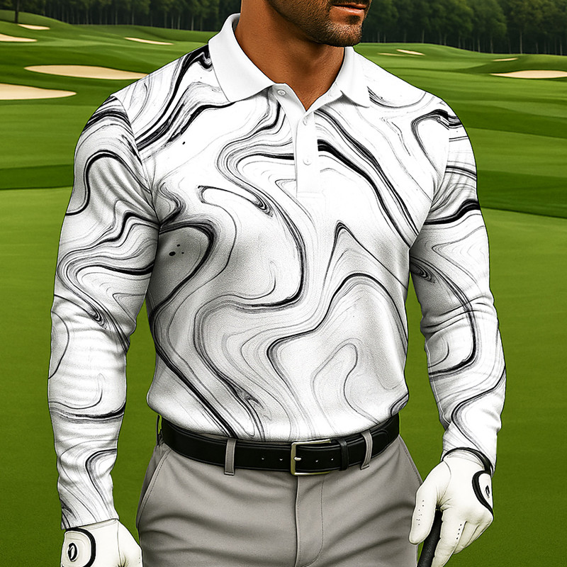 Men's Geometric Line Polo Long Sleeve Polo Shirts Lapel Business Casual Athleisure Daily Wear Pocket 3D Print Buttons Spring Fall White Blue Purple