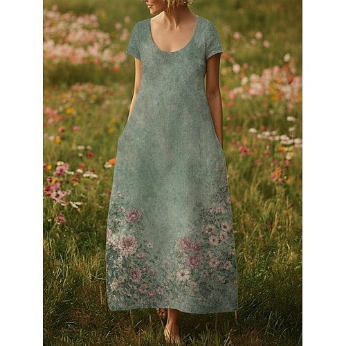 Per donna Abito lungo maxi Abito Boho Vestito Casual Vintage Quotidiano All'aperto Spiaggia Vestibilità comoda Floreale Manica Corta Collo a U Verde Estate Primavera