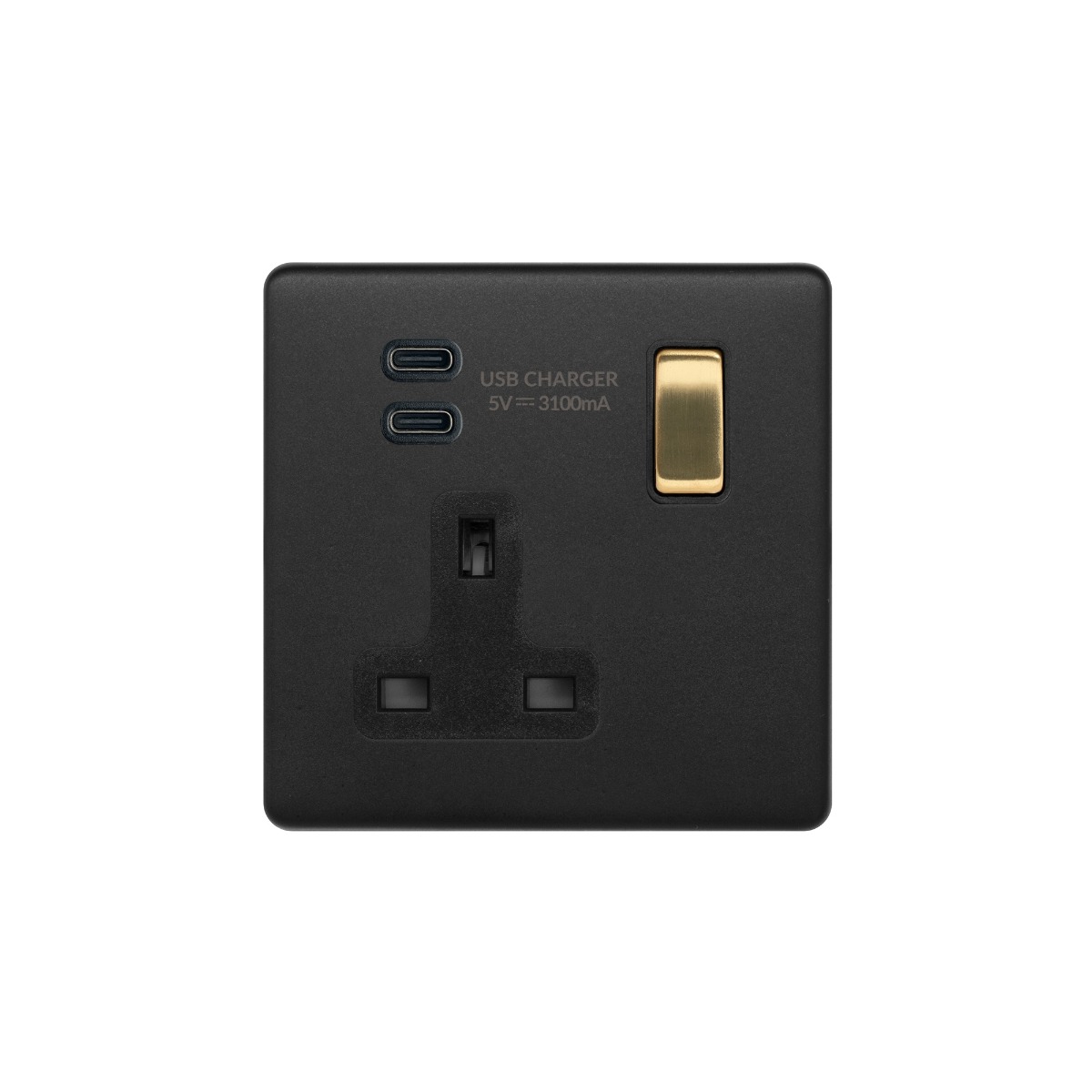 Soho Lighting Matt Black & Brushed Brass 1 Gang USB C+C Socket (13A Socket + 2 USB C 3.1A Ports) Black Inserts