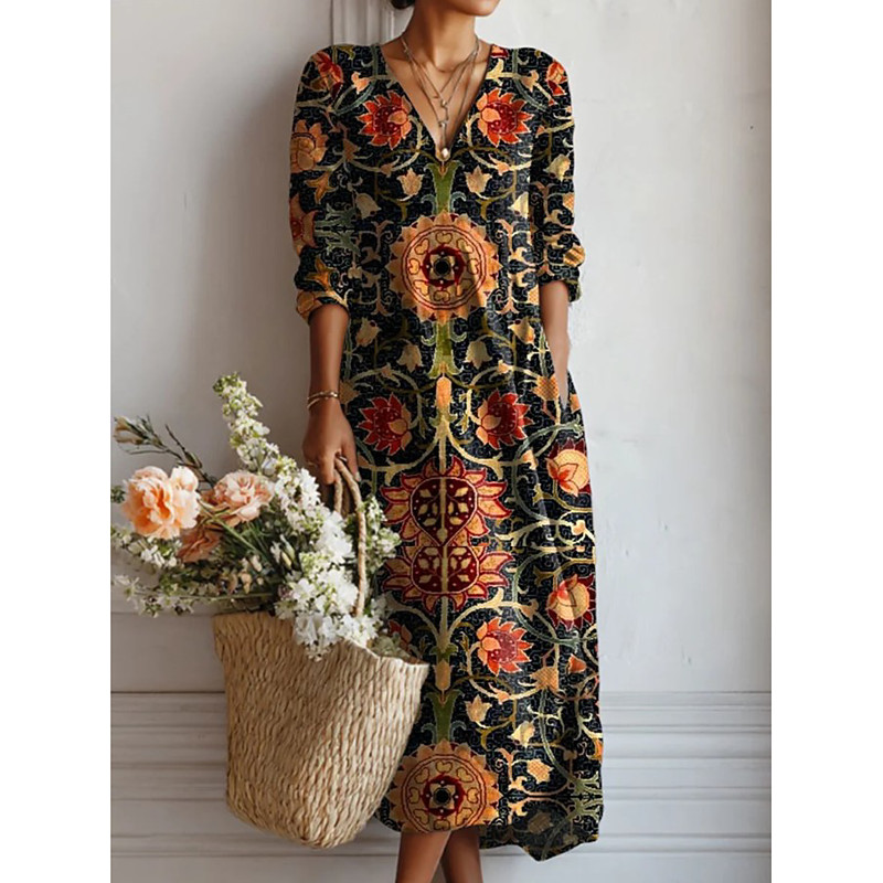 Women's Maxi Dress Sundress A Line Dress Vacation Casual Boho Holiday Regular Fit Floral Graphic Color Block Long Sleeve V Neck Blue Black Orange Summer Spring