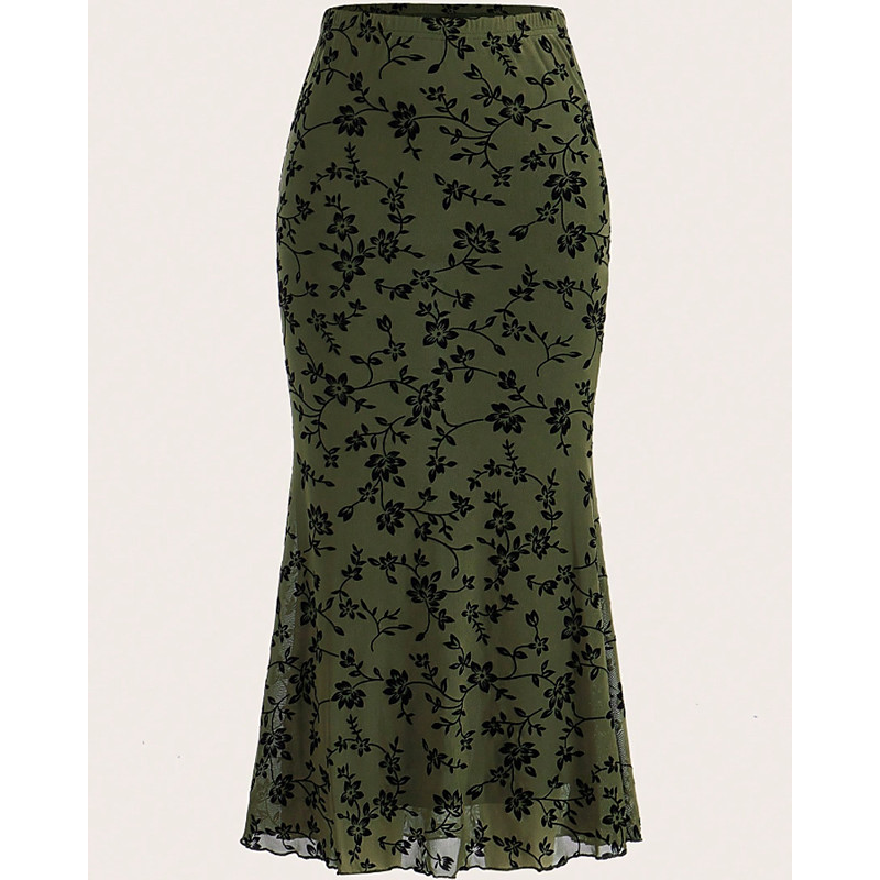 Women's Skirt Casual Midi Mid Waist Skirts Floral Print Inelastic Daily Street Black Dark Green Spring Spandex Polyester