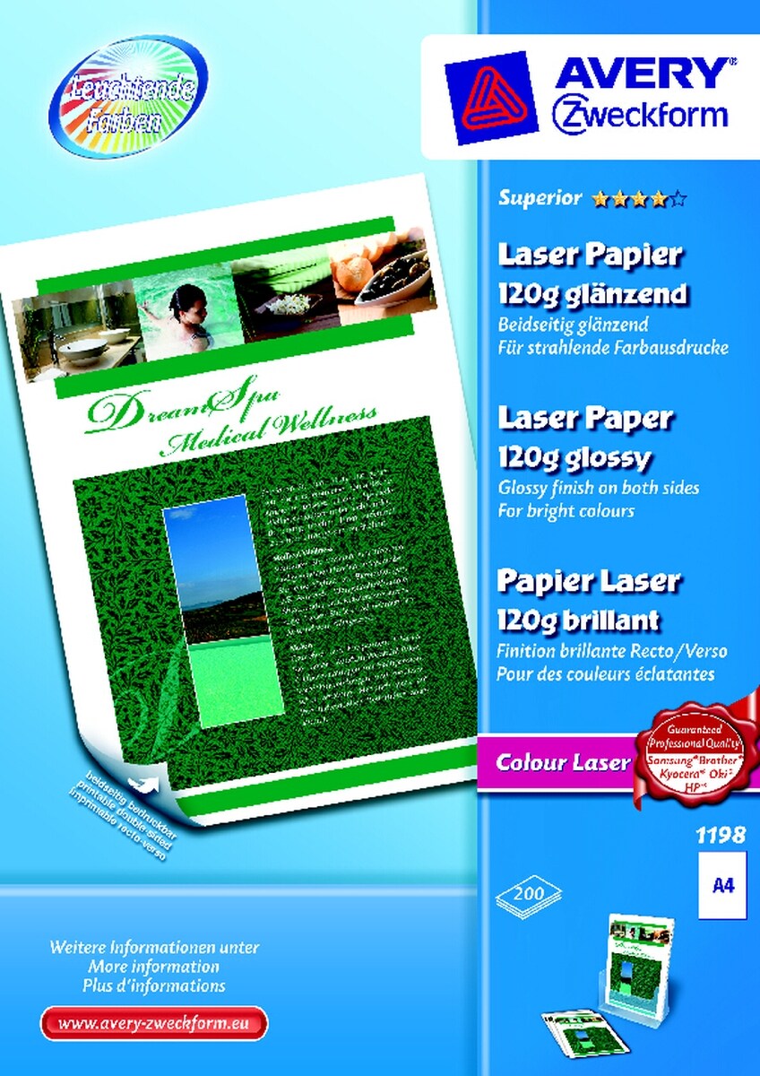 Avery Zweckform Farblaserpapier Superior A4 beidseitig beschichtet glänzend 120 g/qm 200 Blatt Packung mit 12 Stück