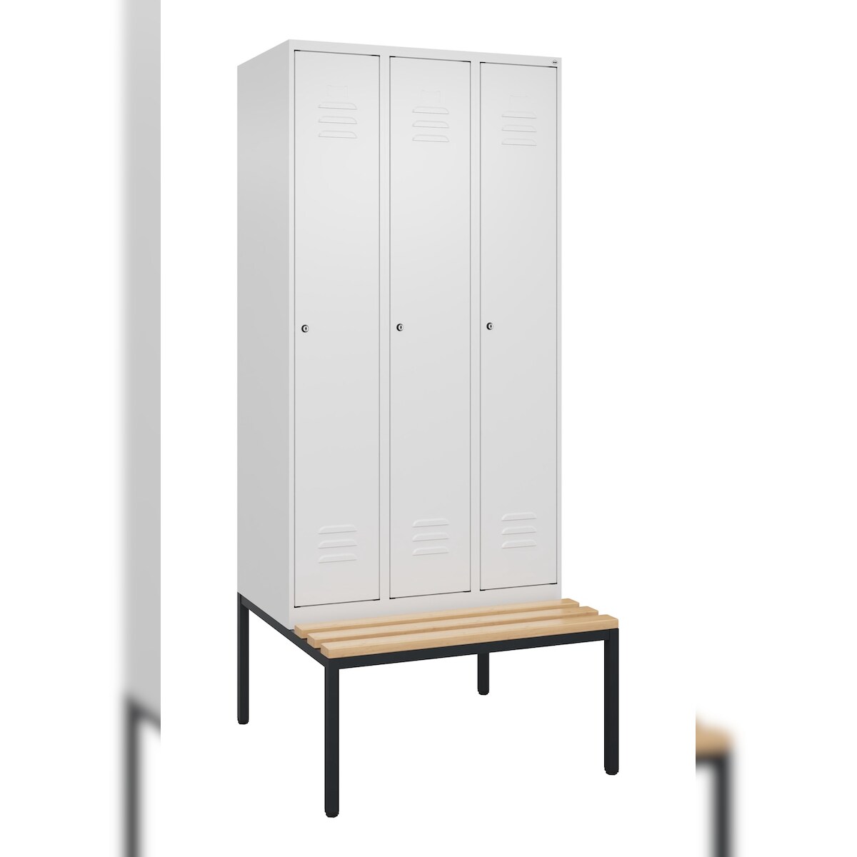 C+P Spind Classic PLUS, Buche untergebaute Sitzbank 3 Abteile, HxBxT 212x90x82cm, Zylinderschloss, Verkehrsweiß von PROREGAL