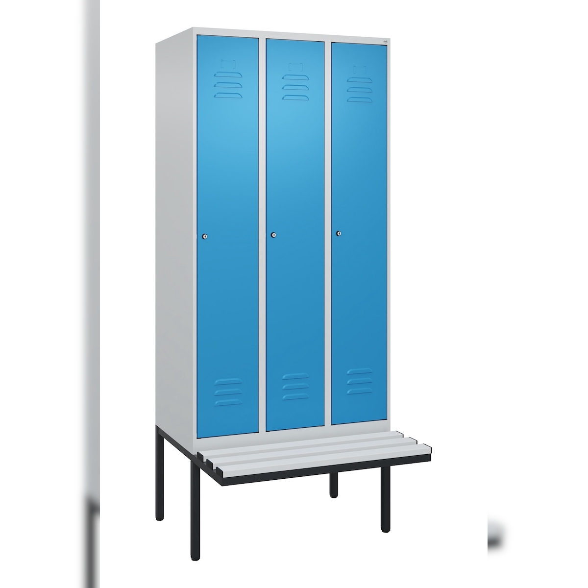 C+P Spind Classic PLUS, Kunststoff schwebende Sitzbank, 3 Abteile, HxBxT 212x90x82cm, Zylinderschloss, Hellgrau/Lichtblau von PROREGAL