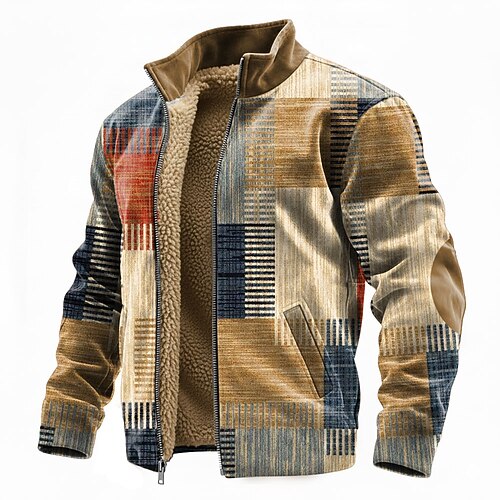Per uomo Geometrico Plaid Pile Giacca di pelle Felpa Moda Quotidiano Semplice Casual Collo alla coreana Con cerniera All'aperto Vacanza Regalo Uscire Blu Marrone Verde Grigio Tasca Cerniera frontale