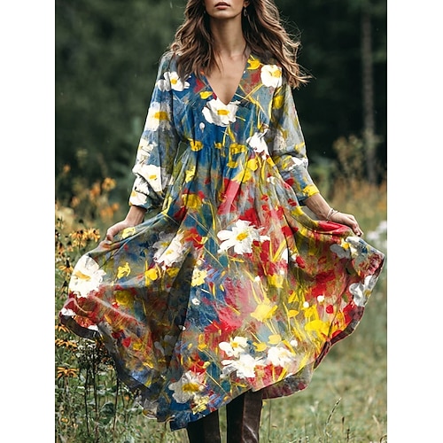 Per donna Abito Midi Abito a trapezio Vacanza Casual Quotidiano Spiaggia Vestibilità comoda Floreale Grafico Manica Lunga Scollo a V Blu Rosso Arancione Estate Primavera