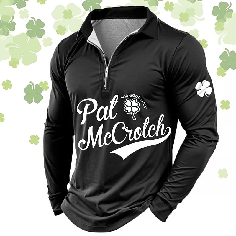 St Patrick's Day Men's Four Leaf Clover Text Zip Polo Shirts Long Sleeve Polo Shirts Lapel Casual Outdoor Festival Outfit 3D Print Spring Fall Black Light Green Green