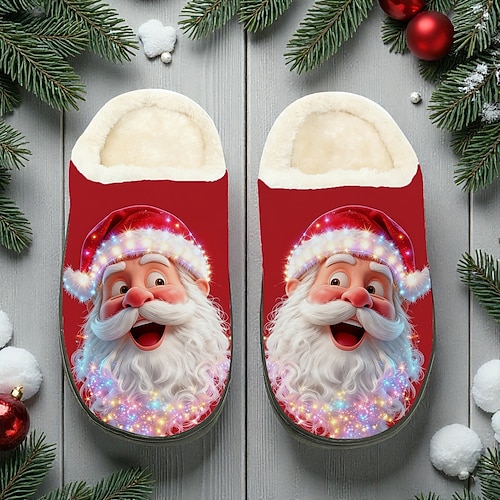 Hausschuhe für Herren mit Weihnachtsmann-Motiv – festliches rotes Weihnachtsmann-Gesicht mit LED-Lichtern, kuschelige Plüschpantoffeln für den Weihnachtsmorgen, zum Entspannen und für die Feiertage