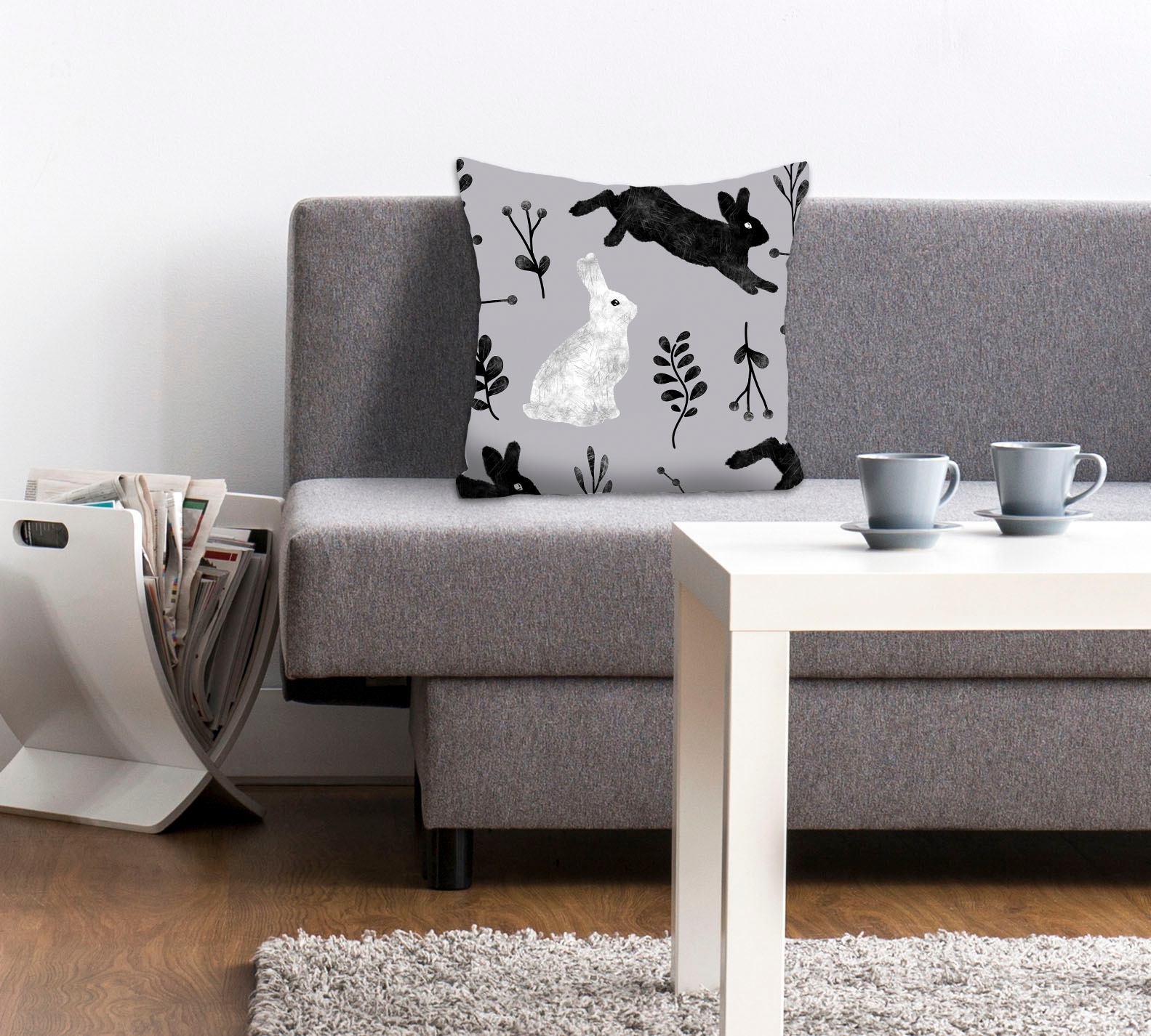 Dekokissen QUEENCE "Eiko", schwarz-weiß (schwarz, grau, weiß, bedruckt), B:40 L:40, Polyester, Dekokissen_Sitzkissen_Kissenhüllen, mit schwarzen und weißen Hasen