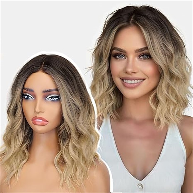Short Wigs for Women Wavy Bob Wig with Bangs Medium Length Synthetic Hair Water Wave Dark Roots Wig Halloween Cosplay Party Wigs