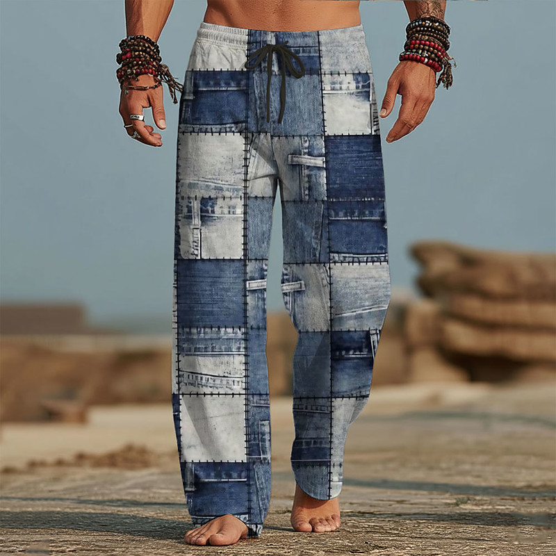 Men's Geometric Color Block Patchwork Trousers Baggy Pants Casual Pants Mid Waist Fashion Home Outdoor Vacation Elastic Drawstring Waist Linen-Like Pants with Pockets Summer Spring 3D Print Blue