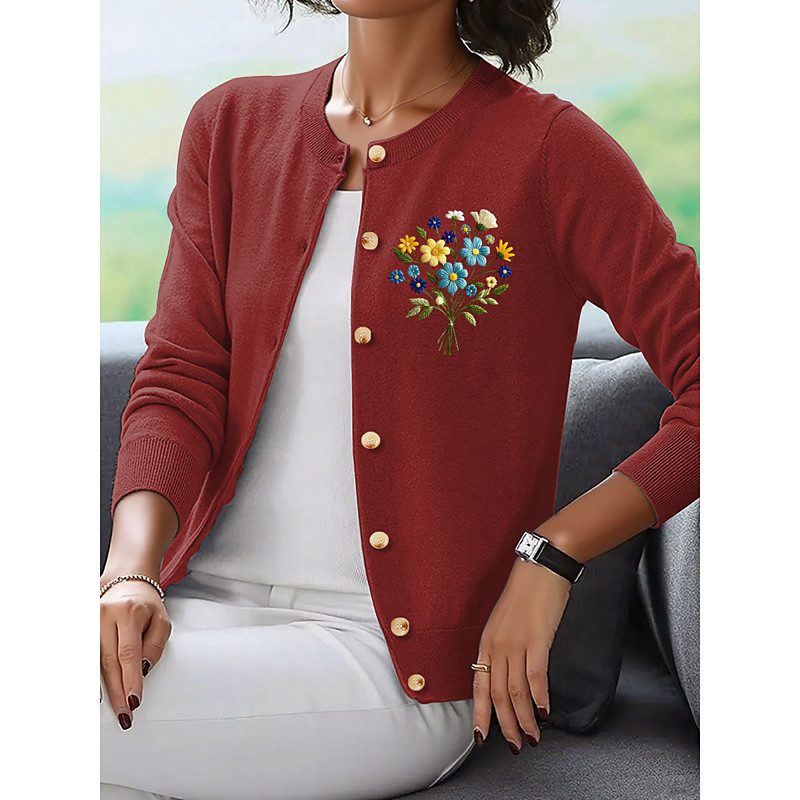 Women's Cardigan Elegant Vintage Daily Floral Graphic Ribbed Crew Neck Buttons Knitted Long Sleeve Regular Tops Knit Outdoor Home Work Black Red Spring Fall