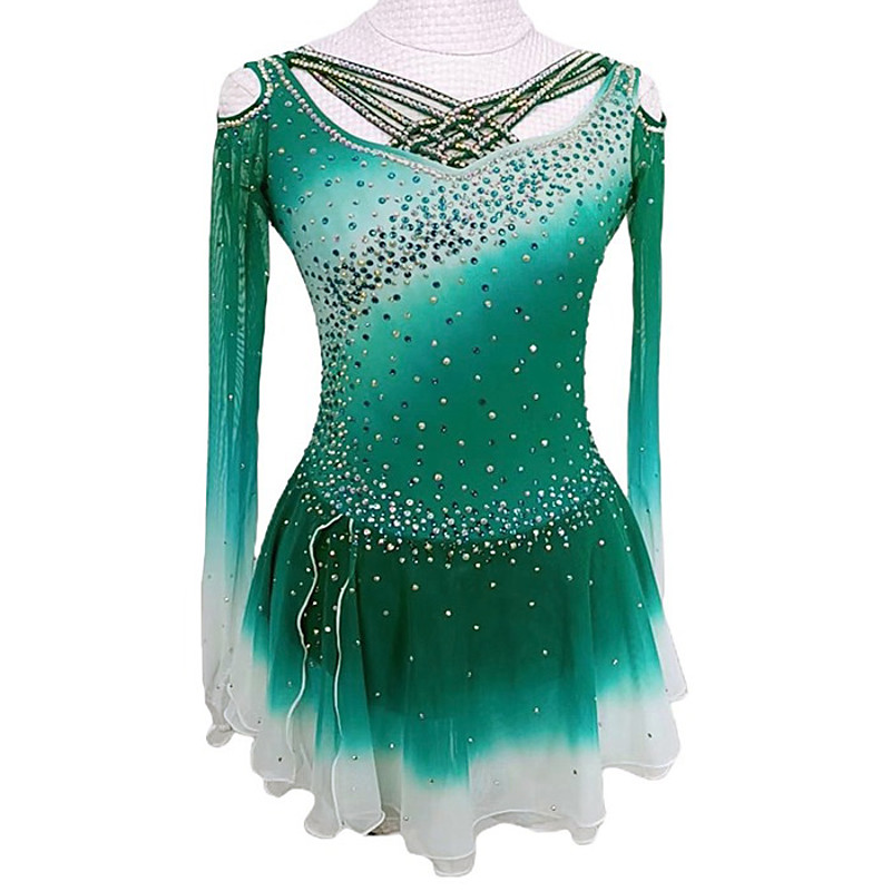 Figure Skating Dress Women's Girls' Ice Skating Dress Green High Elasticity Training Competition Skating Wear Classic Crystal / Rhinestone Long Sleeve Ice Skating Figure Skating