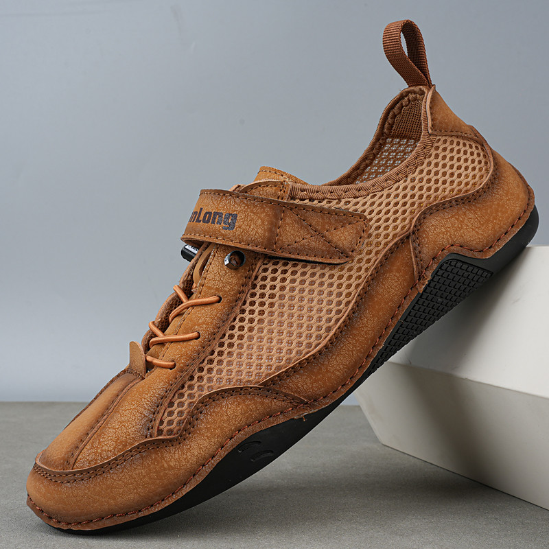 Men's Tan Slip-on Mesh Sneakers with Velcro Strap - Easy-to-wear, Comfortable Footwear for Outdoor Activities and Casual Outings