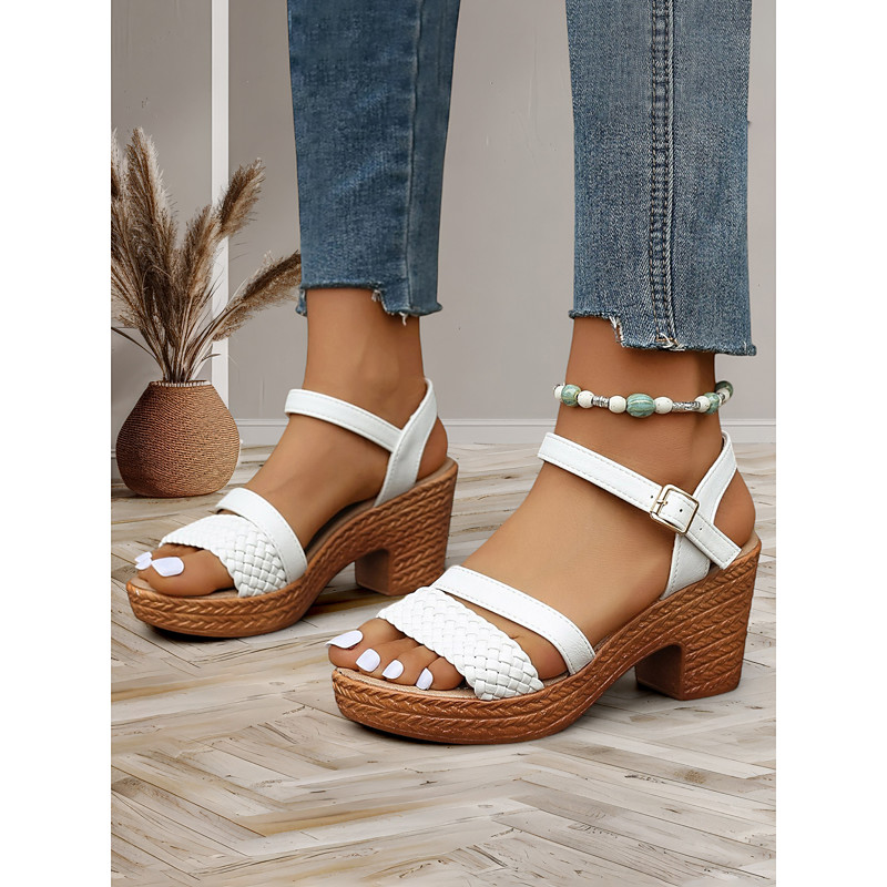 Women's Woven Strap Block Heel Sandals with Adjustable Ankle Buckle – Casual Summer Footwear for Outdoor Events and Everyday Wear