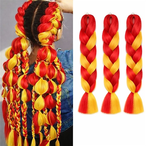 Jumbo-Zopf-Haarverlängerungen in den Farben der spanischen Flagge – leuchtend rote und gelbe zweifarbige Kunsthaarverlängerungen für Festivals und Sportveranstaltungen DIY Bubble Braids