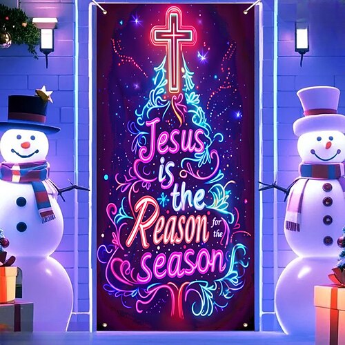 Copertura per porta con luce nera natalizia, tenda natalizia raffigurante Gesù, motivo della stagione con albero di Natale luminoso e decorazioni festive per l'ingresso di casa a Natale