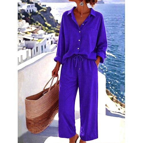 Per donna Camicia Set di biancheria in cotone Set da due pezzi Pantaloni di Lino Pantaloni Manica Lunga Colletto a Camicia Tinta unica Coulisse Moda Streetwear Abbigliamento quotidiano Data Bianco