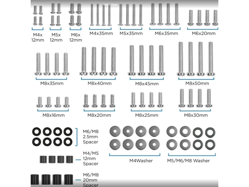 Monteringskit til vægbeslag med møtrikker, spacere og skiver. Alt fra M4 til M8 i forskellige længder