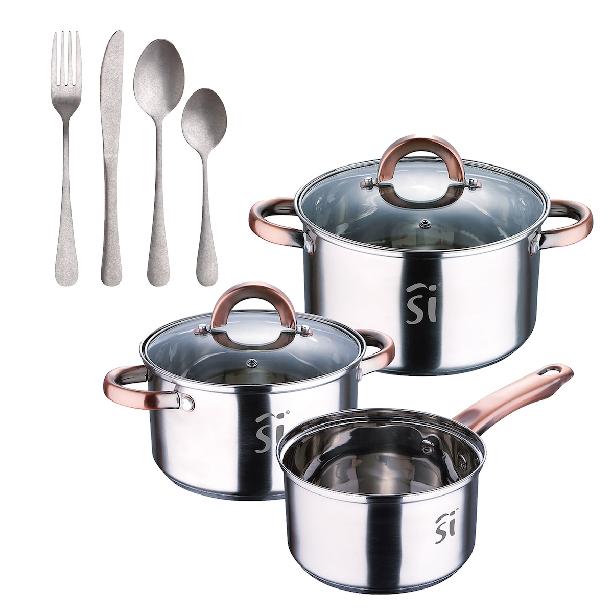BERGNER - 5-teiliges Kochgeschirr-Set Ø16/18/20cm aus Edelstahl, geeignet für Induktionsherde, mit 16-teiligem Edelstahl-Besteckset von NOIA