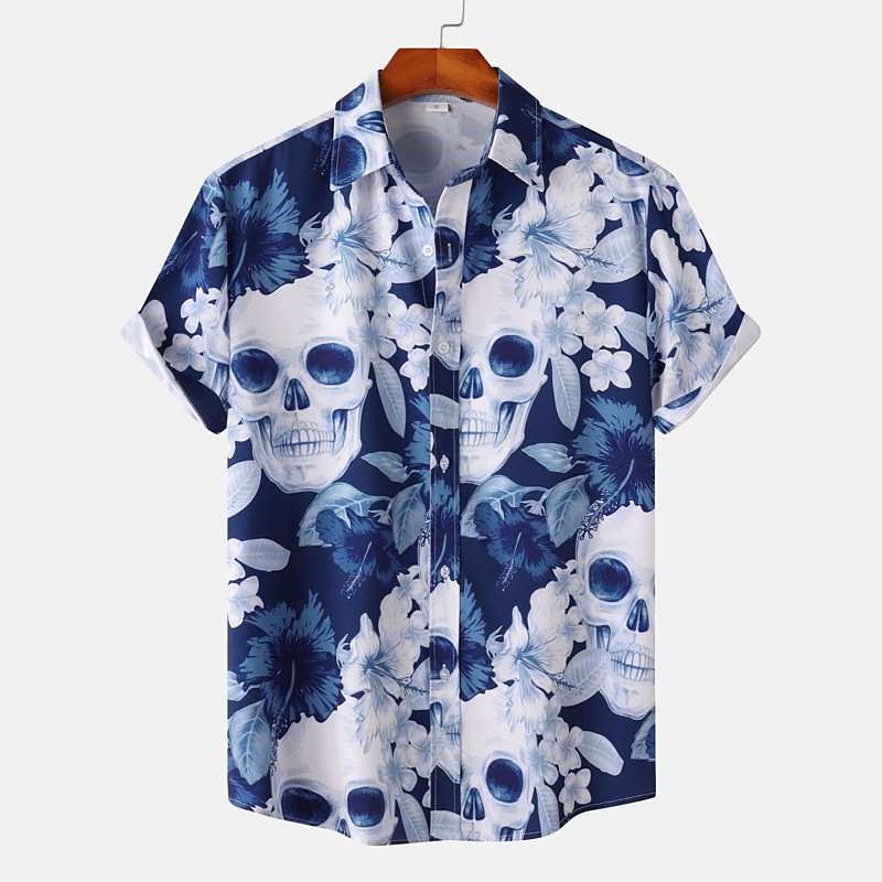 Men's Skulls Flowers Shirt Summer Shirt Casual Shirt Short Sleeves Vintage Horror Vacation Daily Wear Theme Party Spring Summer Lapel Print WhiteBlack Black White Red Blue