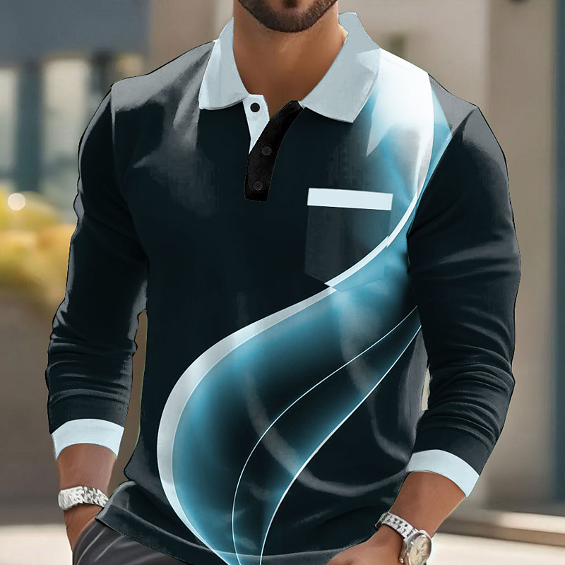 Men's Geometric Line Polo Long Sleeve Polo Shirts Lapel Casual Business Casual Athleisure Daily Wear Pocket 3D Print Buttons Spring Fall Lake blue White Red