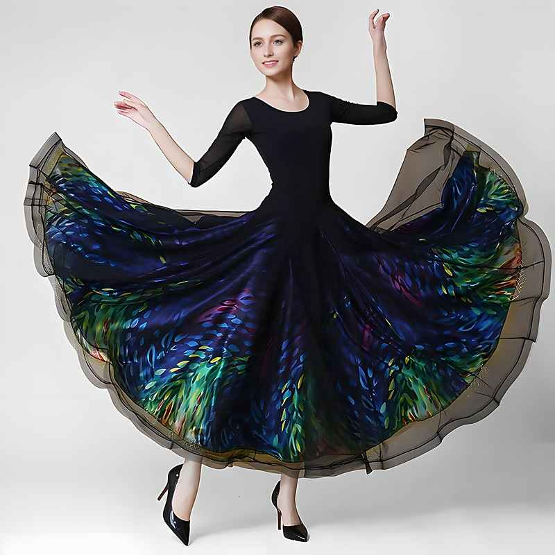 Women's Black Latin Dance Dress with Crystal Rhinestone Detail and Layered Tulle Skirt for Salsa, Tango, and Performance Wear