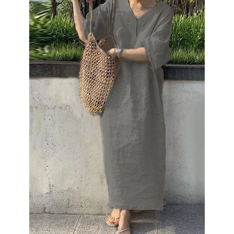 Women's Maxi Dress Cotton Linen Dresses Casual Dress Basic Casual Vacation Daily Date Regular Fit Plain Short Sleeve V Neck Khaki Army Green Dark Blue Gray Summer